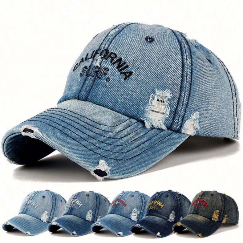 Casquettes de baseball en jean bleu clair personnalisées avec logo brodé, effet vieilli, unisexe, vente en gros directe usine