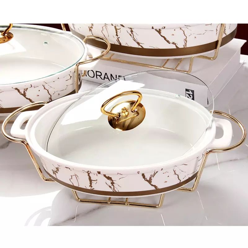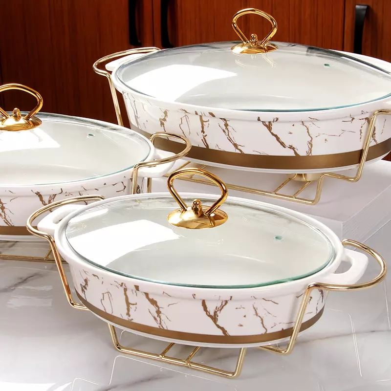Vente en gros usine direct restaurant utilisé de luxe forme ovale marbre buffet en céramique chauffe-aliments avec support