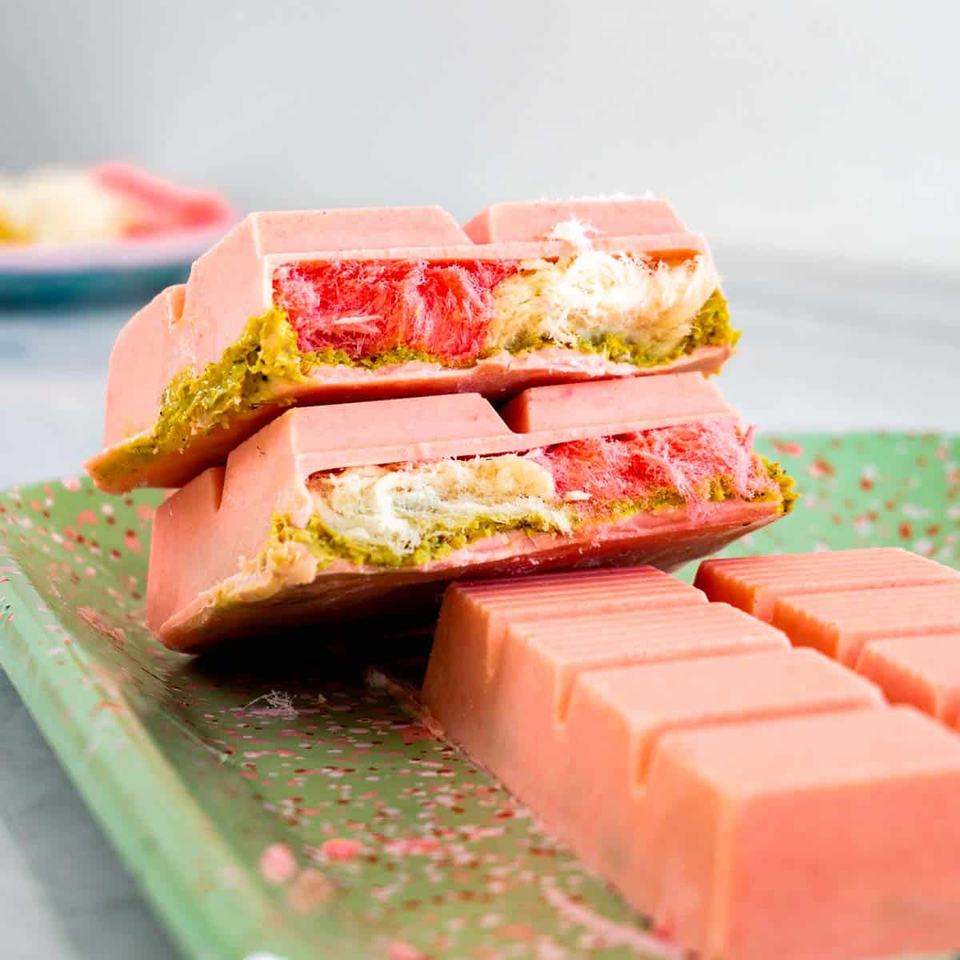 Vente directe d'usine en gros, prix compétitif, barre de chocolat Angel Hair et chocolat de Dubaï (Pistache Knafeh), barre de chocolat rose bonbon