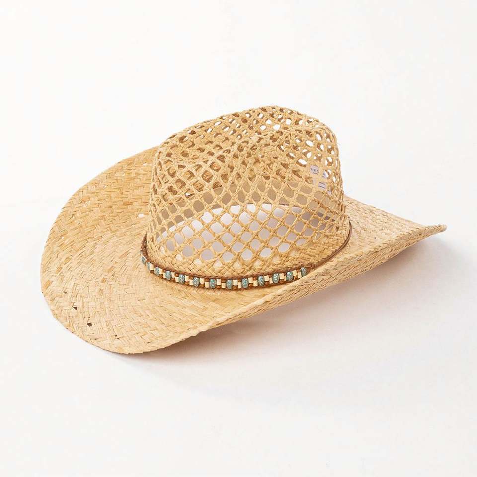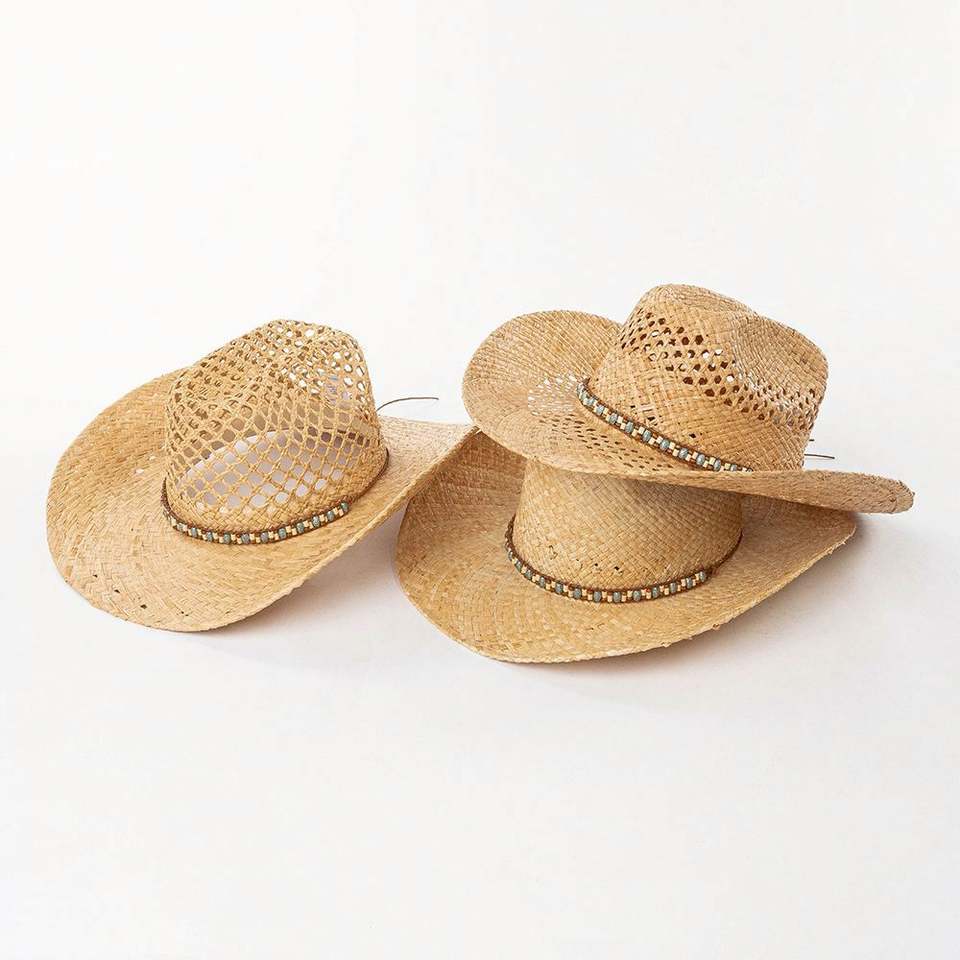 Chapeau de soleil d'été en paille de raphia tressé à la main, tendance, ajouré, style western, avec perles décoratives, pour le voyage, vente en gros