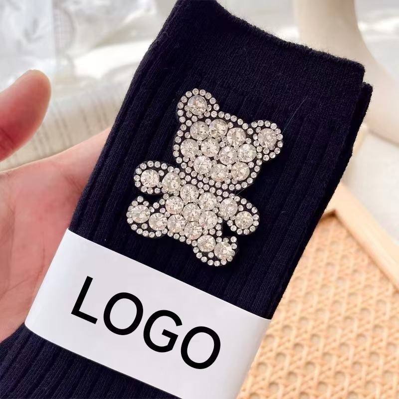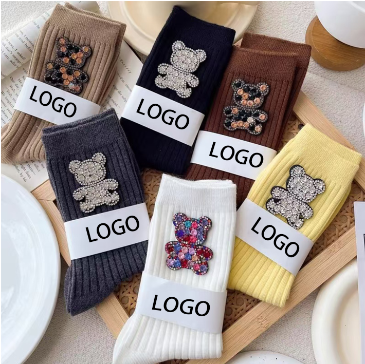 Wholesale Fashionable Custom Logo Colorful 100% Cotton Crew Socks for Women New Autumn Design Crystal Bear Emblem Cuff Bottom