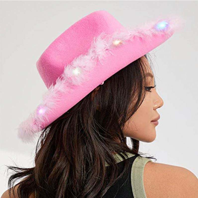 Name:Light Up Cowgirl Pink Cowboy Hat With Feather Edge