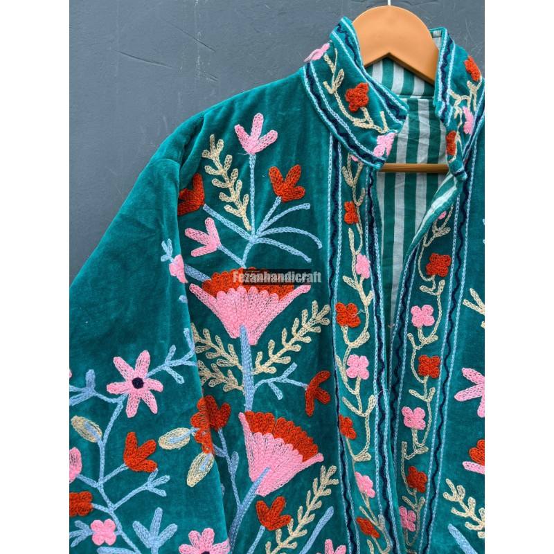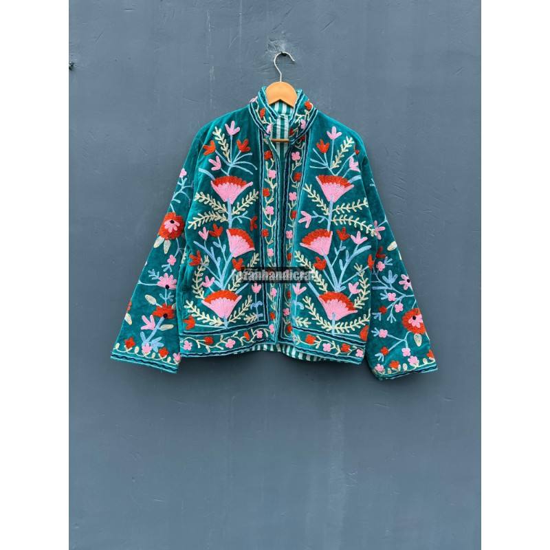 Vente en gros tricoté coton fleurs broderie matelassé veste courte faite à la main vert velours Suzani unisexe fête porter manteau pardessus
