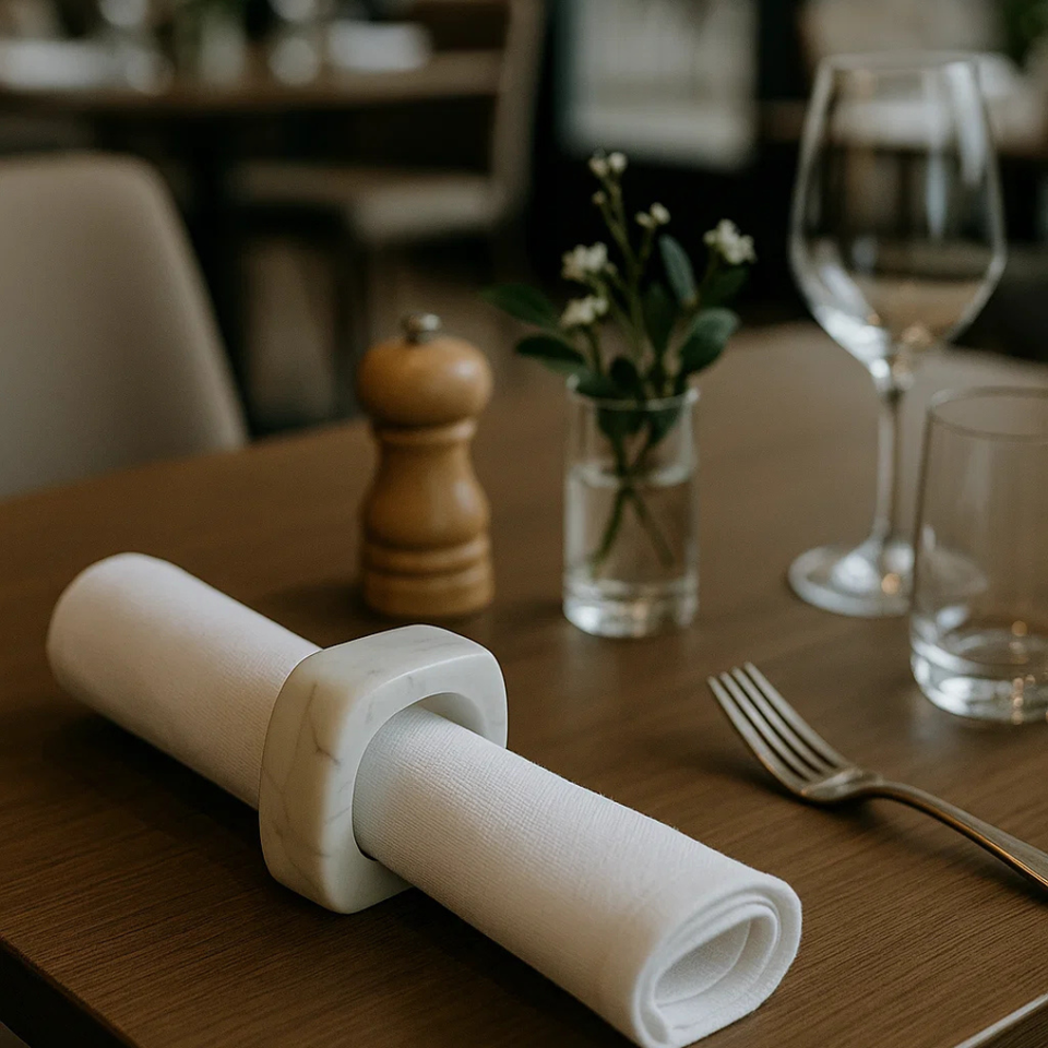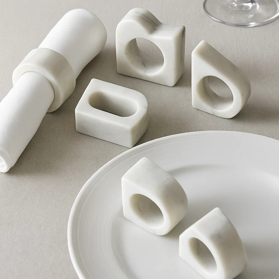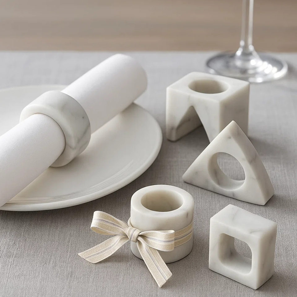 Vente en gros d'anneaux de serviette en marbre blanc géométrique, ensemble de décoration de table artisanale pour les mariages, événements et repas de luxe, commandes en gros personnalisées