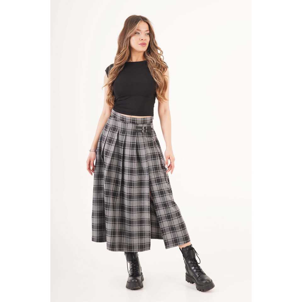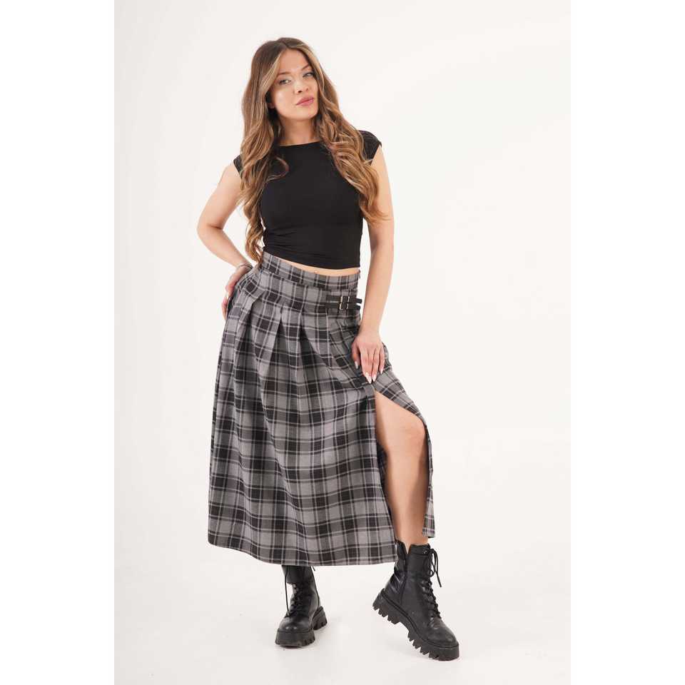 Jupe longue à carreaux gris en gros, taille empire, détail ceinture, fentes latérales, décorations plissées - Tissu en cuir véritable et en mousseline, style uni