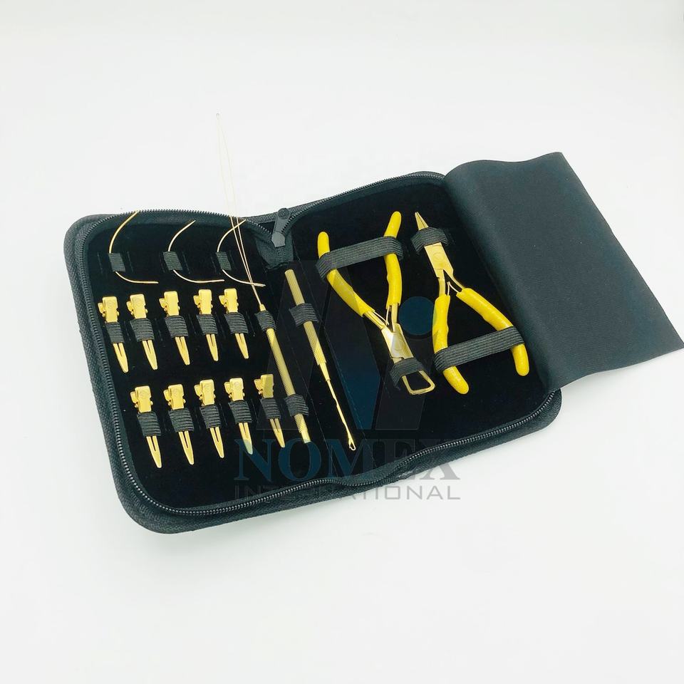 Kit d'outils de pose d'extensions capillaires de haute qualité pour étudiants, avec pinces, clips, aiguilles, outils à boucle et crochet, revêtement couleur or plasma