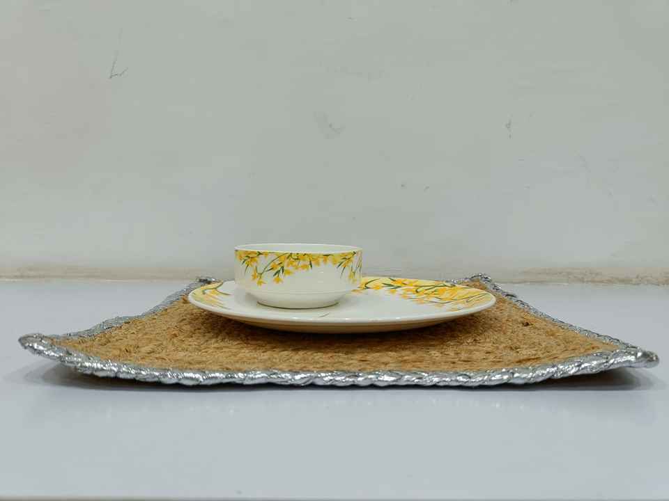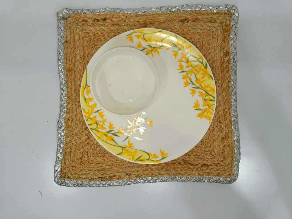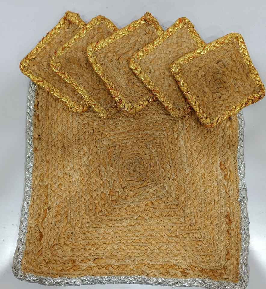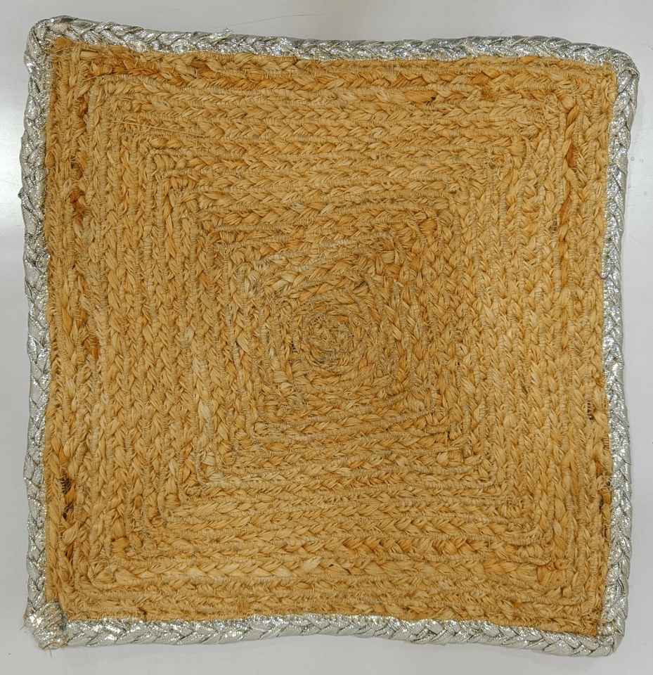 Vente en gros de sets de table ronds faits à la main en jute 100% avec bordure argentée, design moderne uni, taille personnalisable pour mariage, banquet, usage domestique
