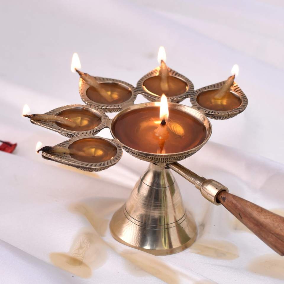 Nom du produit:Lampe à huile 6 mèche en laiton doré avec poignée en bois