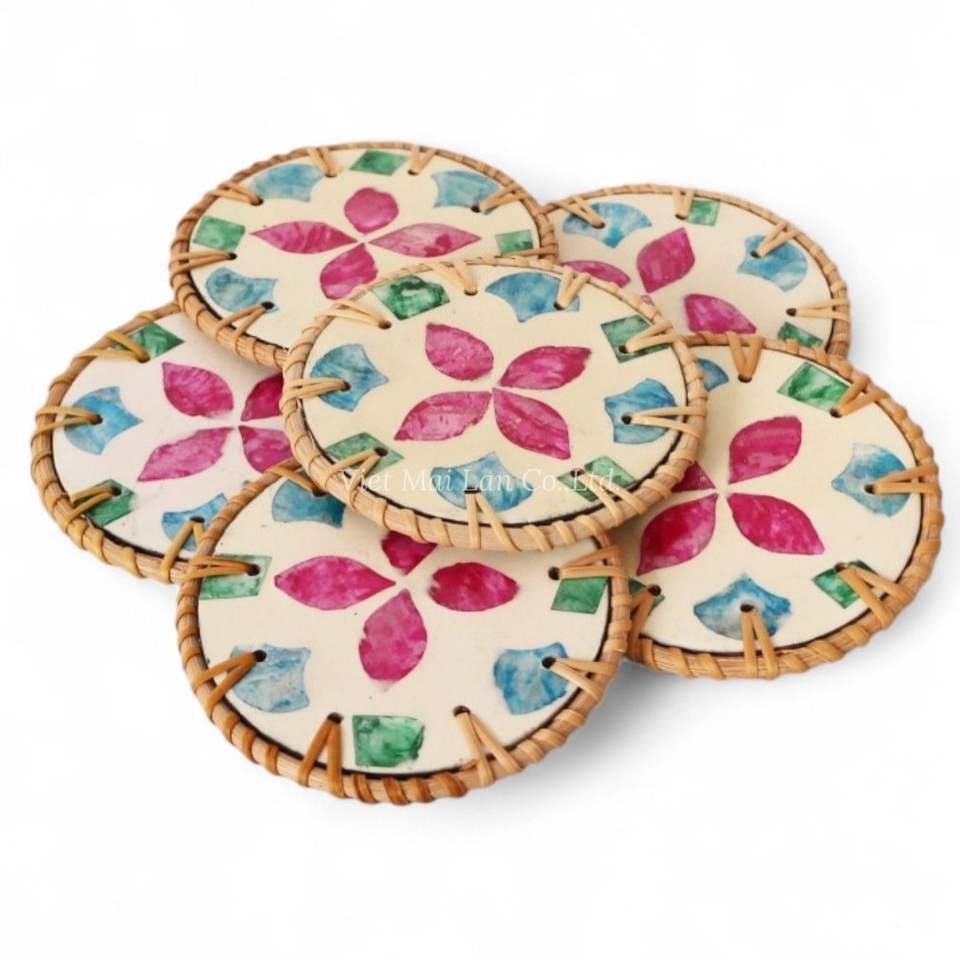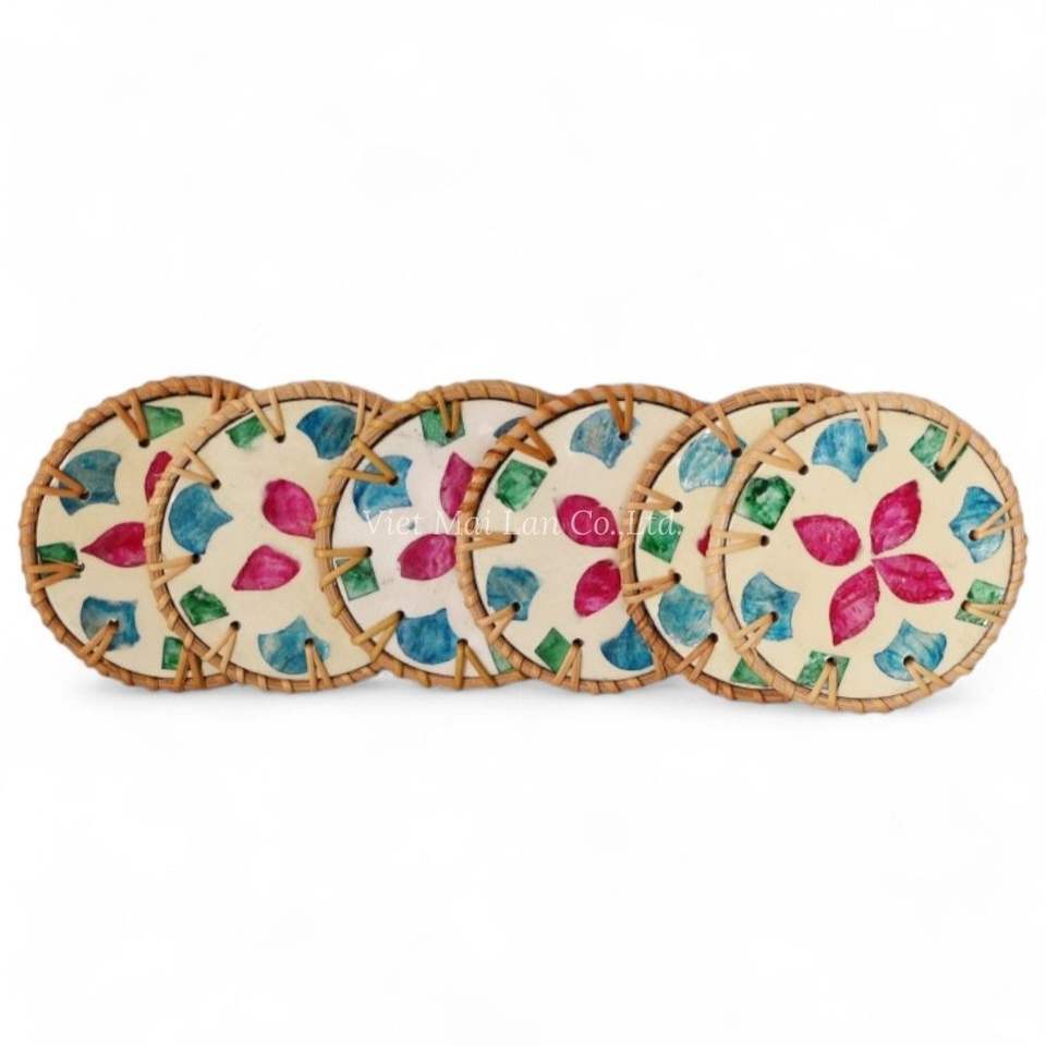 Wholesale Handcrafted Mother of Pearl Coaster with Natural Rattan Border for Bulk Orders Home Decor and Table Protection