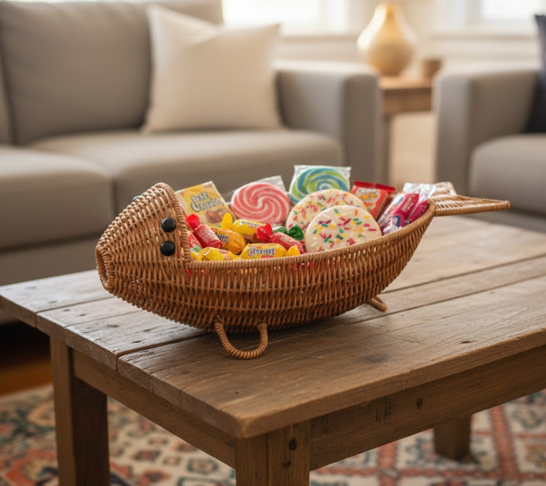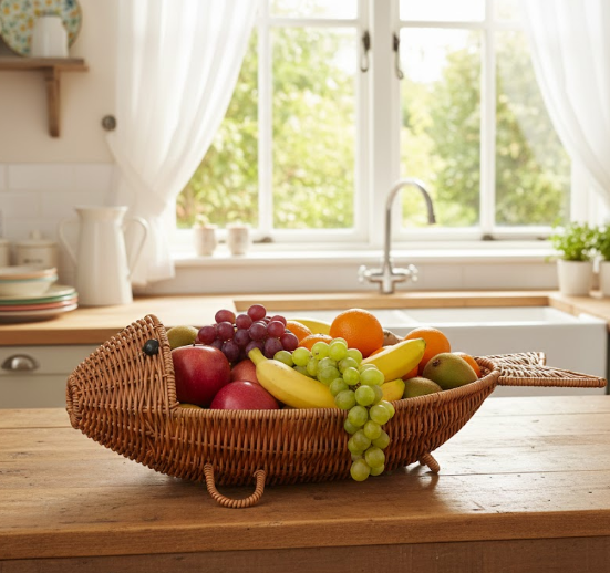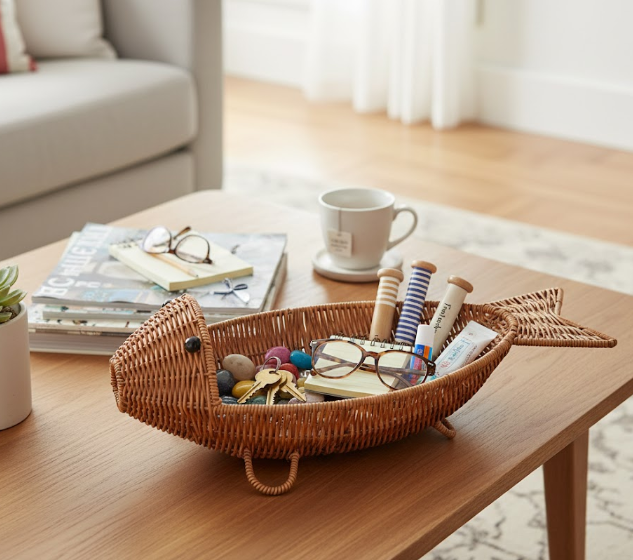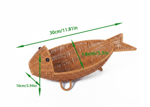 Panier de rangement en rotin naturel fait main en forme de poisson pour fruits, collations et décoration intérieure, fabriqué au Vietnam