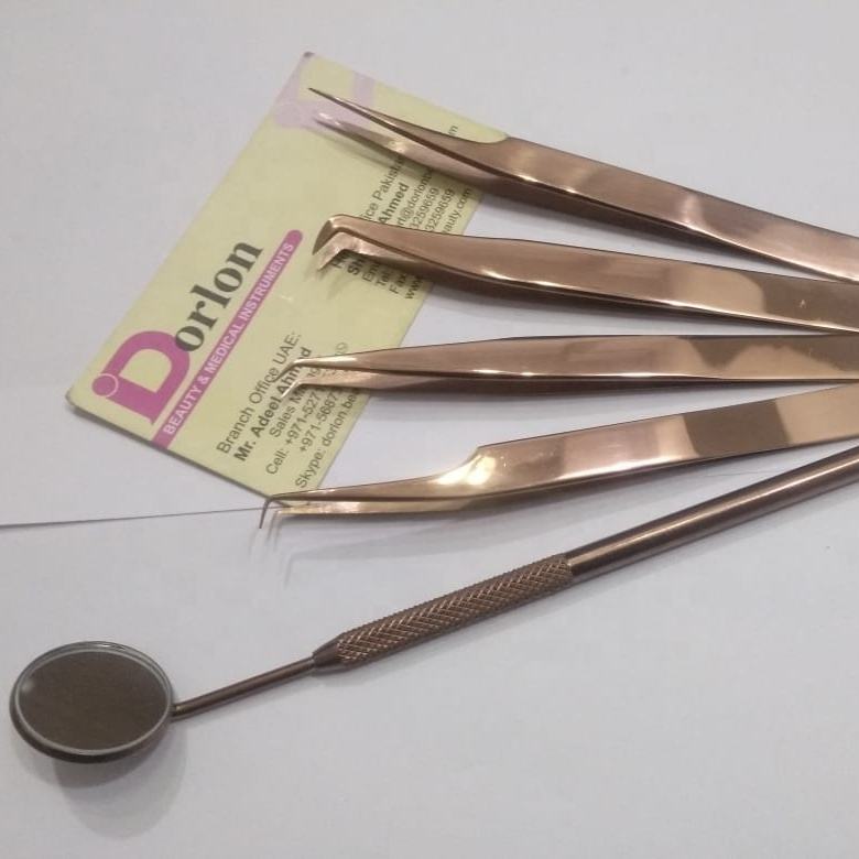 Vente en gros de pinces d'extension de cils haut de gamme en acier inoxydable en or rose ensemble avec miroir en or rose