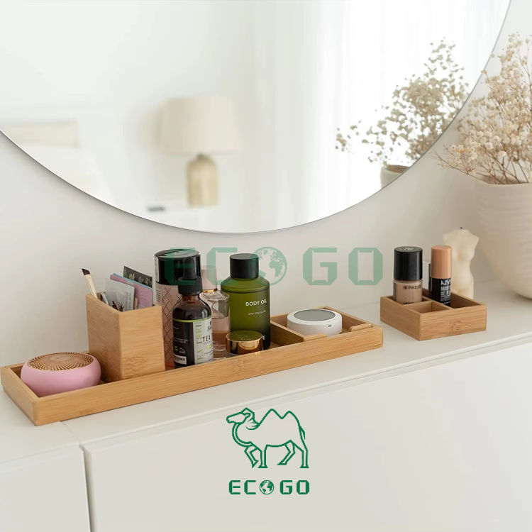 Wholesale High Quality 6-piece Natural Bamboo Wooden Bathroom Accessories Sets for Countertop Vanity Tray Set Bathroom