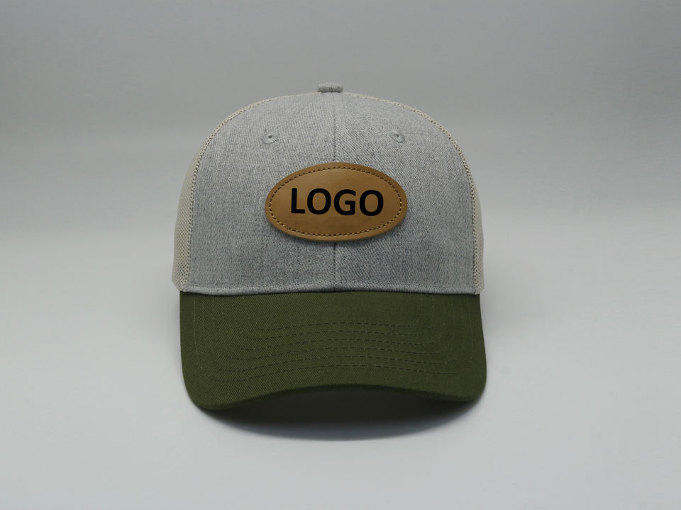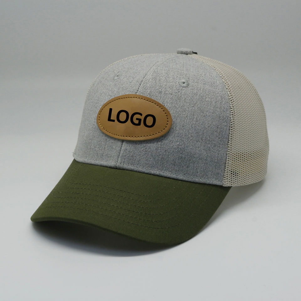 Vente en gros d'écussons en cuir brodés personnalisés de haute qualité 6 panneaux en laine et maille ajustés casquettes de baseball casquette de camionneur