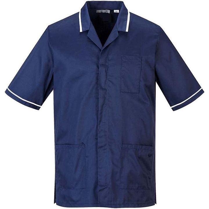 Vente en gros de blouses d'infirmière pour hommes de haute qualité, personnalisées, à col rabattu, avec bordure blanche, logo, ensembles de blouses sans couture en poly.
