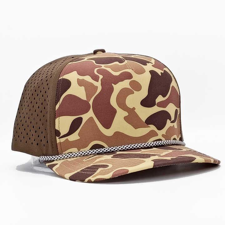 Wholesale High Quality OEM Perforated Camo Cap Flat Brim Performance Hat Laser Cut Hat Waterproof Custom Baseball Hat With Rope