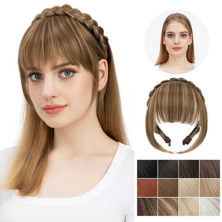 Franges synthétiques de haute qualité en gros, résistantes à la chaleur, franges soignées pour femmes et filles, style naturel, bandeau tressé, serre-tête