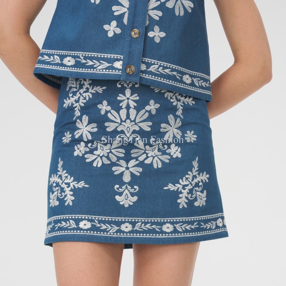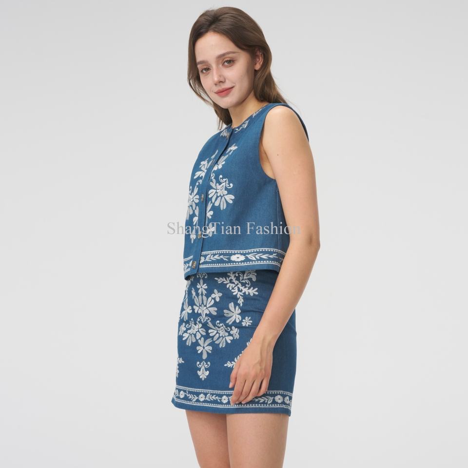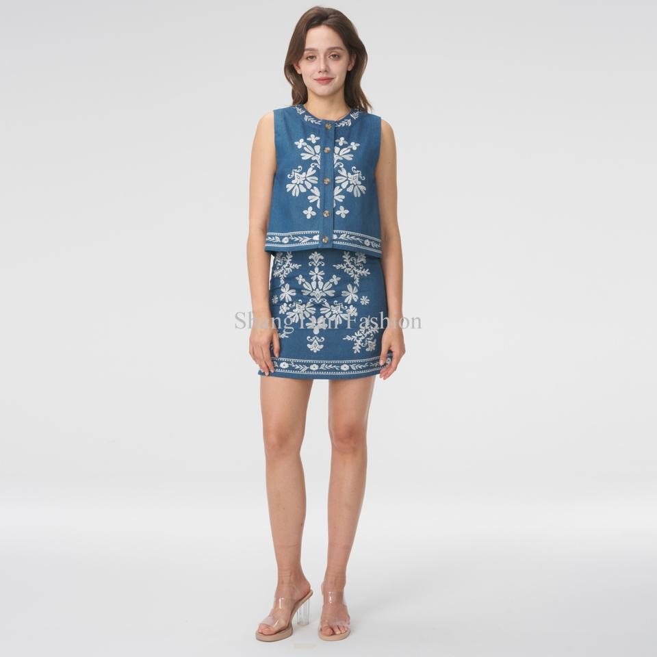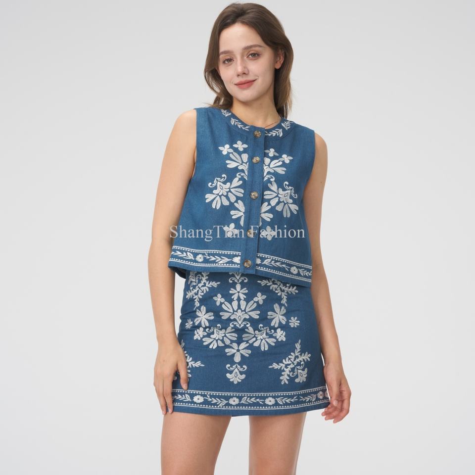 Vente en gros de haute qualité, ensemble deux pièces, broderie personnalisée, haut sans manches avec jupe courte