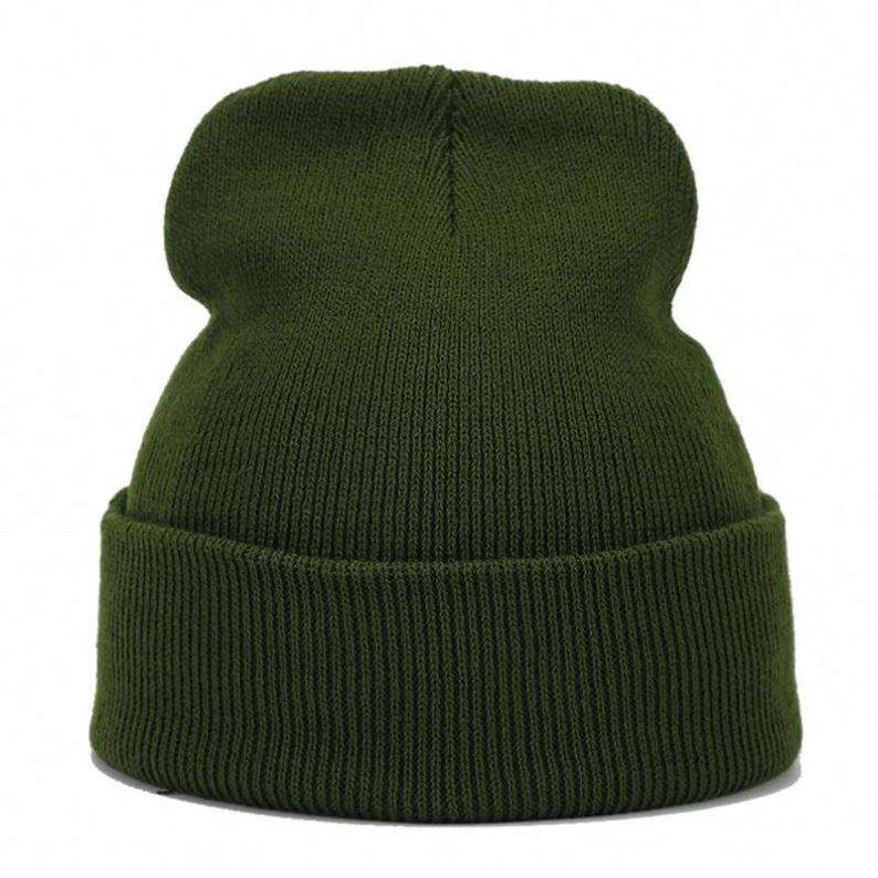 Vente en gros Chapeaux d'hiver unisexes de haute qualité, couleur unie, tricotés en acrylique à revers, bonnets personnalisés avec logo brodé