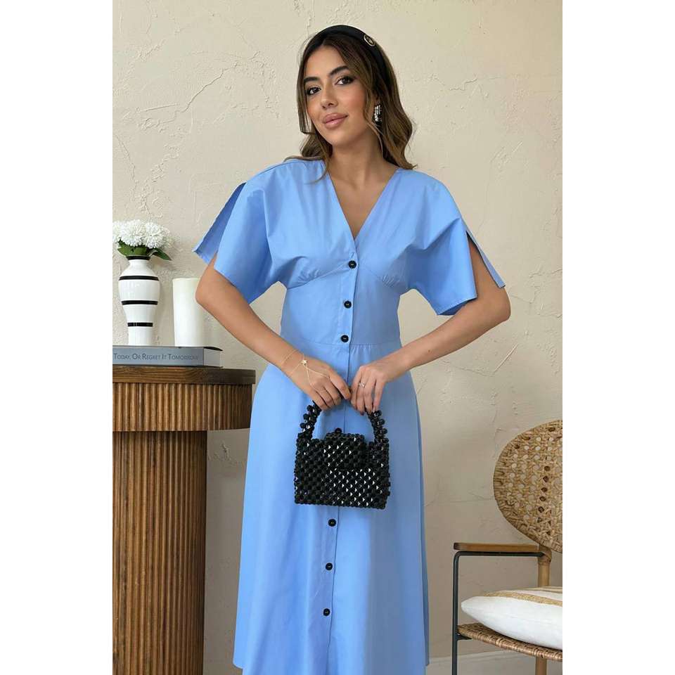 Wholesale High Vintage Poplin Dress Midi Length Blue Buttons Floral Solid Empire Ruffles XS for Day Cheap for Spring Autumn