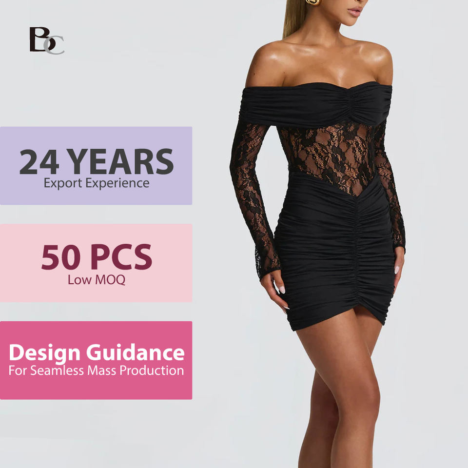 Robe de soirée moulante en dentelle transparente à manches longues et épaules dénudées, de qualité supérieure, en gros, ODM/OEM, sur mesure, pour femmes