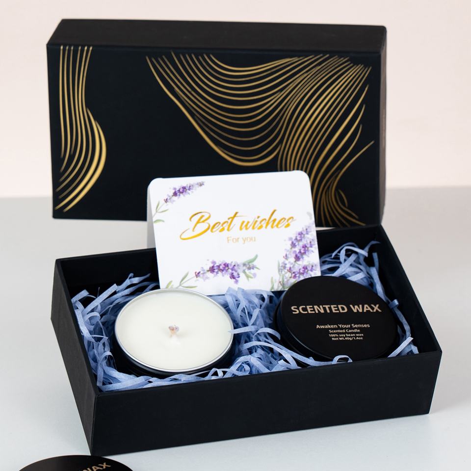 A kit include:100%Soy wax candle 40g*2, gift box*1,raffia*1,blank greeting card*1