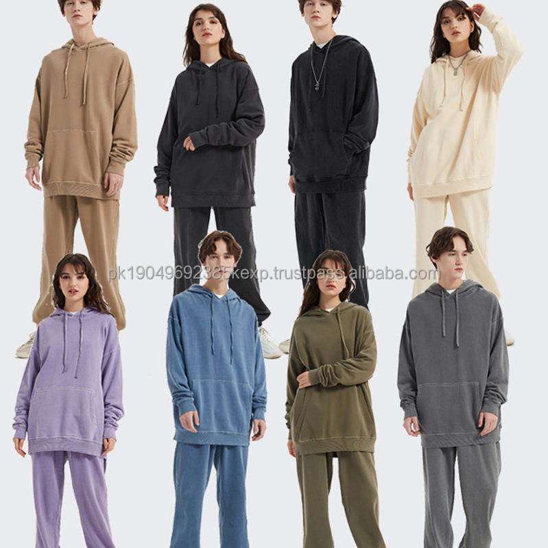 Wholesale Hot Sale Unisex Hoodie Set Custom Logo Embroidered 100% Cotton Acid Washed Solid Pattern Hooded Neckline for Men Women