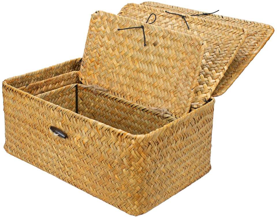 Nom du produit:Poubelles de rangement en osier tressé avec couvercle, meilleures ventes Amazon, lot de 3