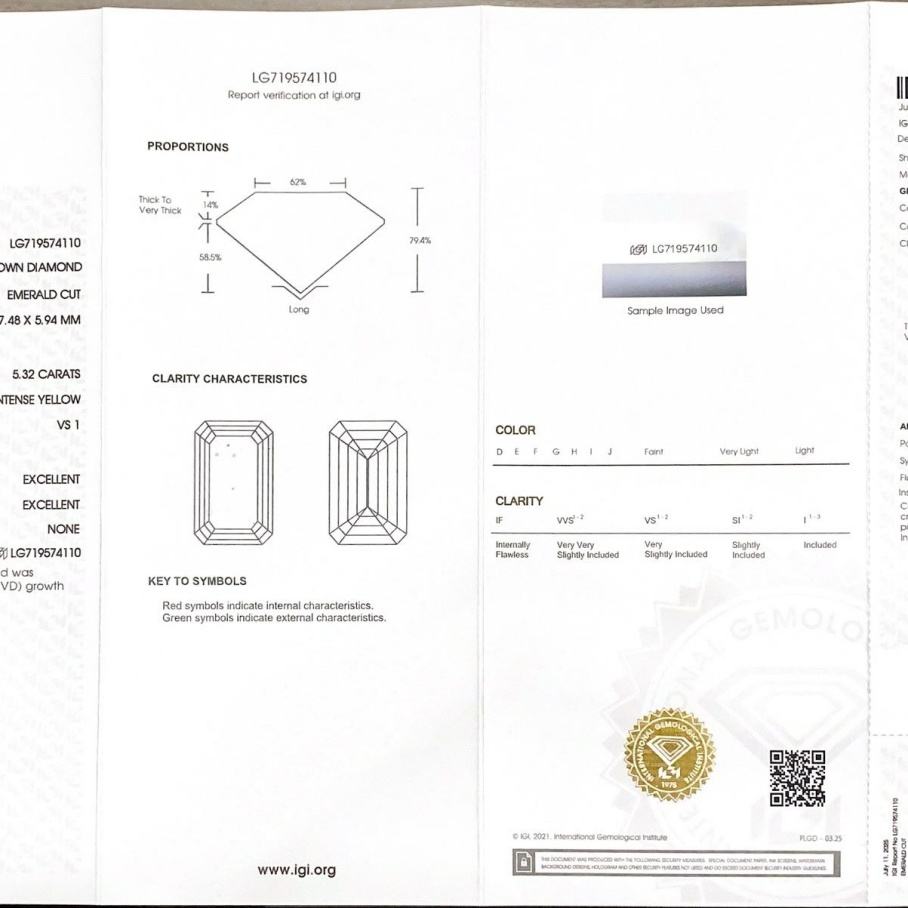 Diamant CVD en vrac de 5,32 carats VS1 de qualité IGI, taille émeraude, couleur jaune intense fantaisie, cultivé en laboratoire