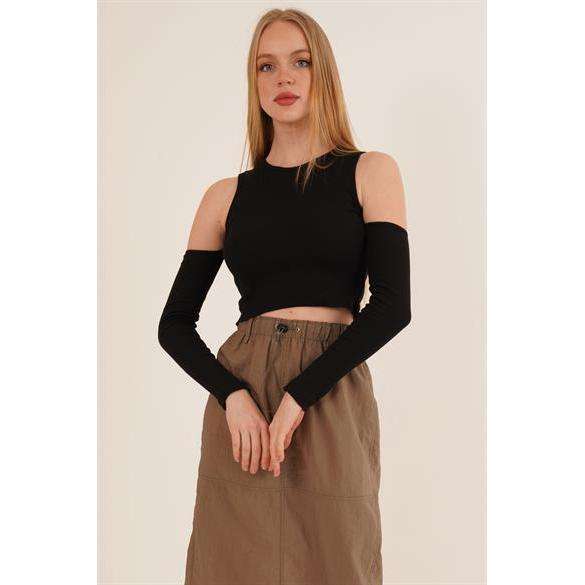 Wholesale Ladies' Black Crew Neck Blouse Shoulder Detail Embroidered Logo Sequins Silk Knitted Fabric for Autumn Spring XL