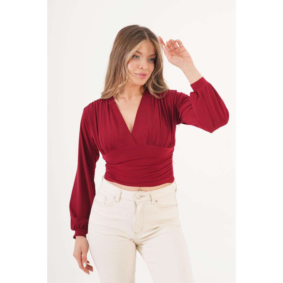 Chemisier bordeaux brodé pour femme, col en V, drapé à la poitrine, disponible en taille XL, idéal pour le bureau, en soie tricotée vintage, automne-printemps