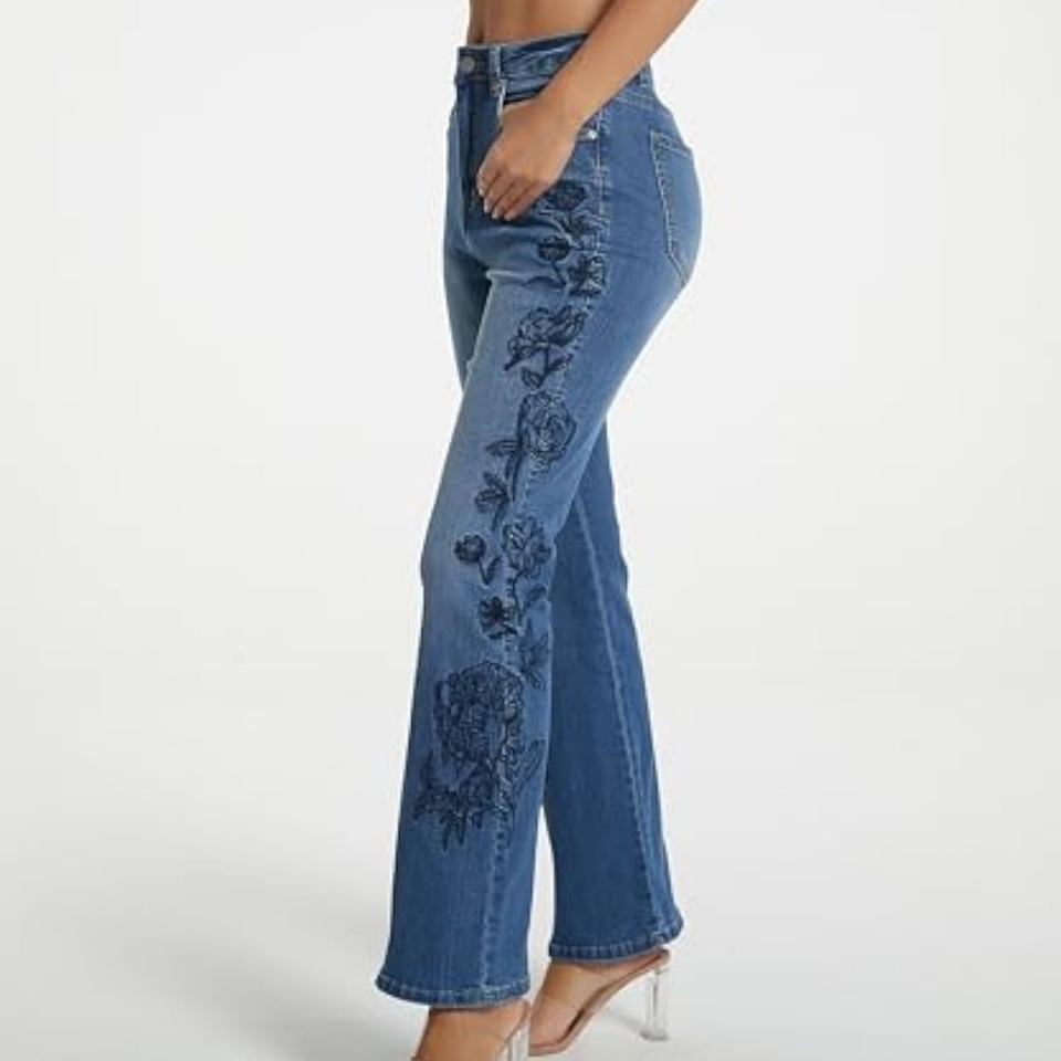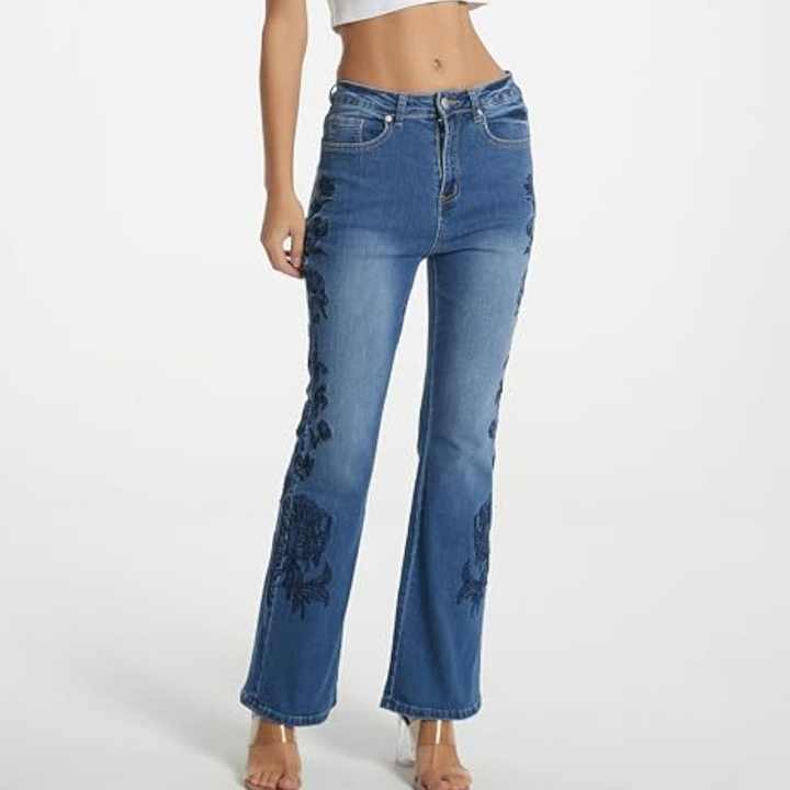 Jeans pour femmes en gros, personnalisés, délavés, brodés de fleurs, en denim, coupe évasée, tendance