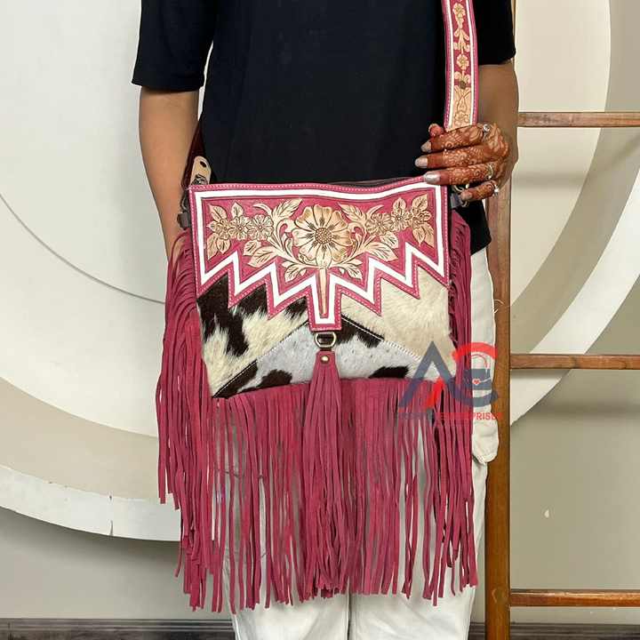 Hand Tooled Cowhide Leather Tassel Crossbody Bag
