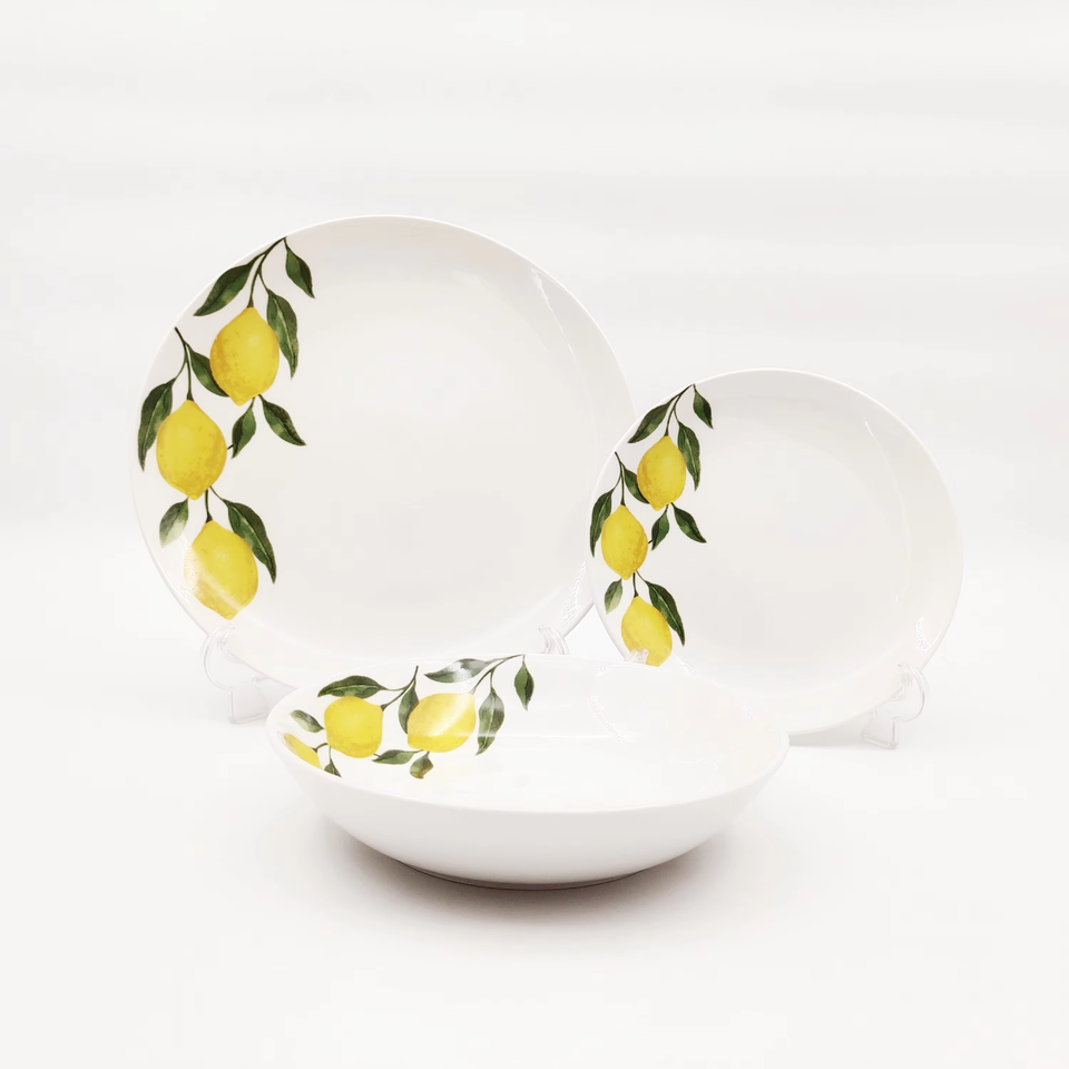 Lot de 18 pièces de vaisselle en céramique motif citron frais pour service de table, assiettes et bols pour 6 personnes, prix de gros