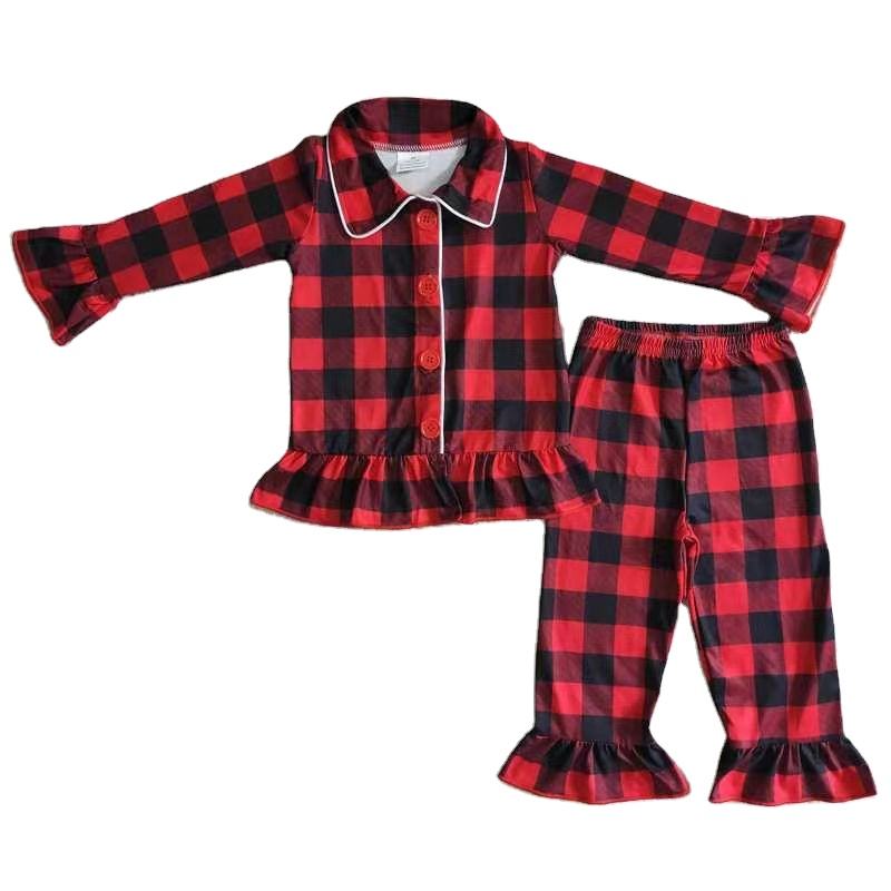 Wholesale Little Girl red Black Plaid Christmas Long Sleeve Clothing Set Fall pajamas for Kids