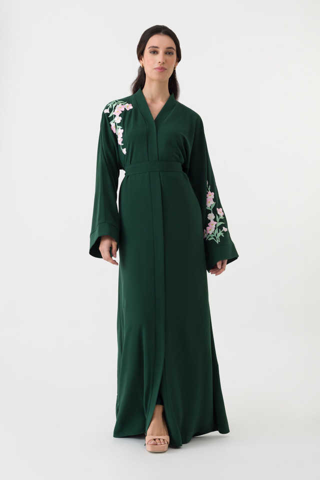 Abaya de prière islamique turque de luxe en soie vert émeraude à motifs floraux, anti-rides, sur mesure, design long et élégant, vente en gros