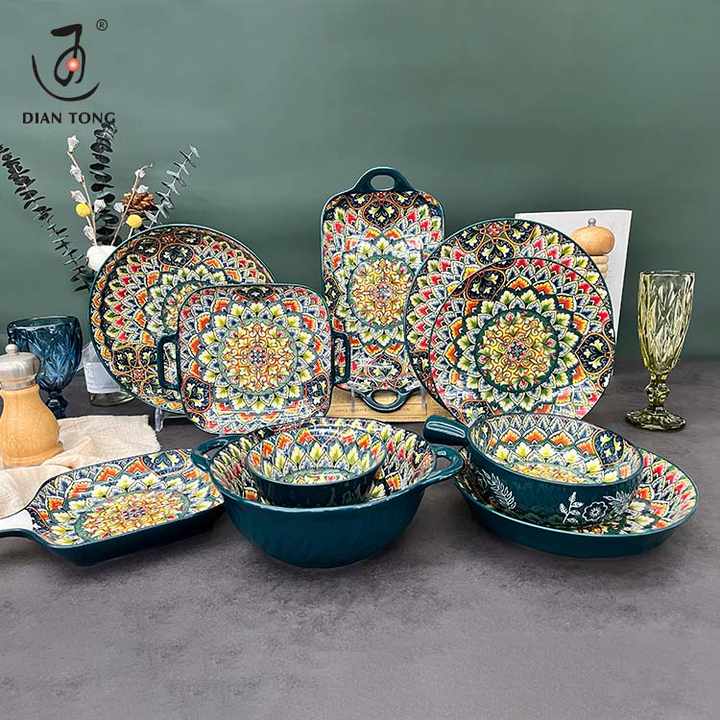 Wholesale Luxury Vintage Green Tableware Ceramics Dinnerware Dinner Plates and Bowls Bohemian Plates Set for Restaurant Dishes