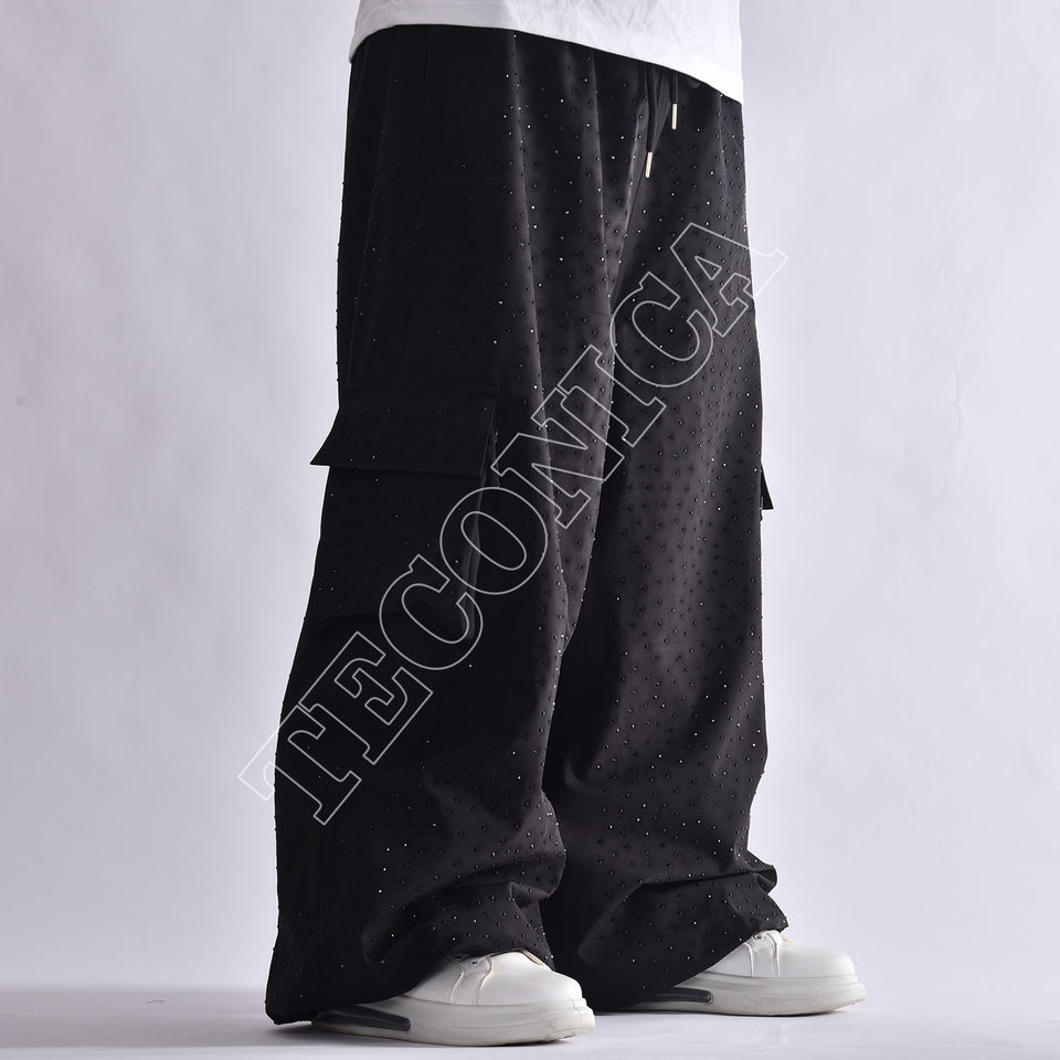 Wholesale Men's Black Winter Snow Pants with Scattered Rhinestone Studs Wide-Leg Design and Adjustable Comfort Features