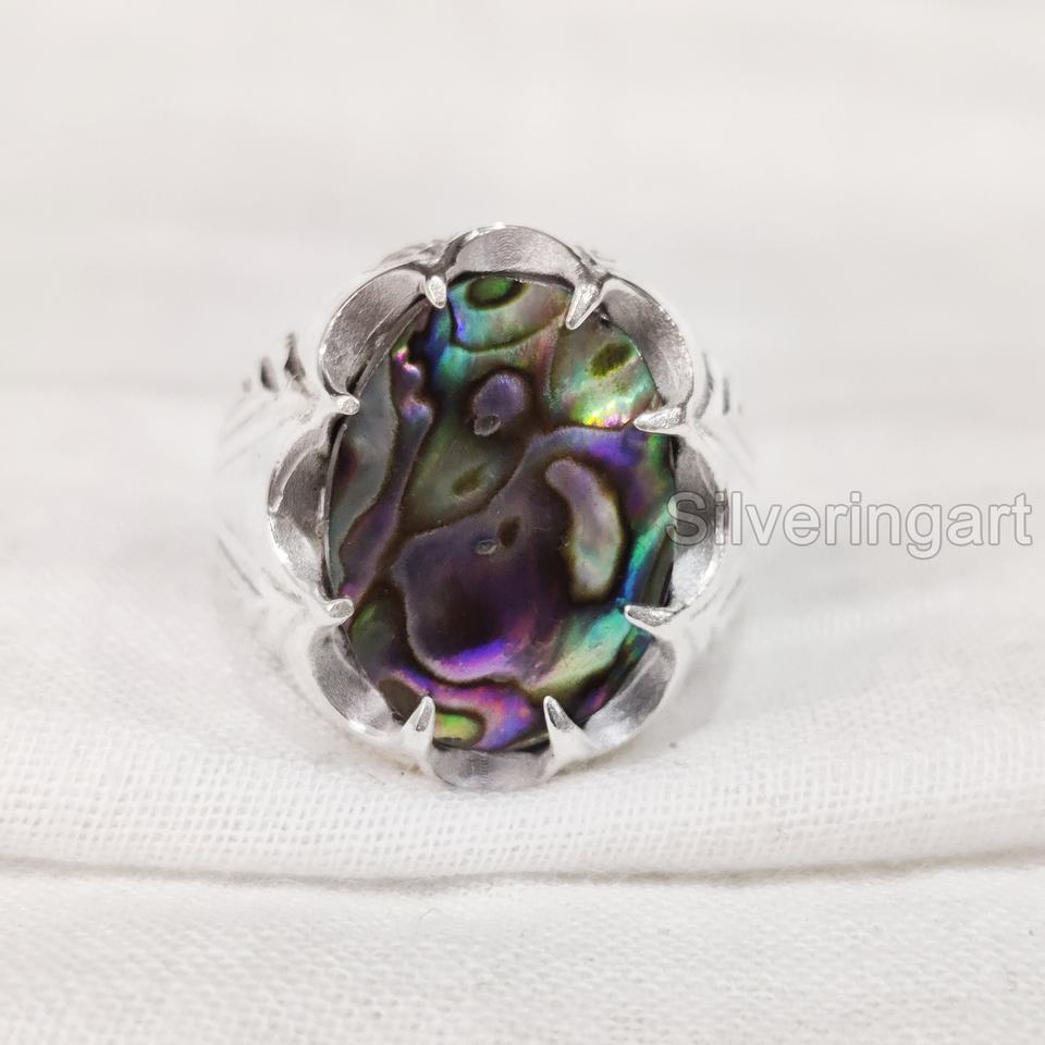 Vente en gros de bagues pour hommes en forme de coquillage d'ormeau naturel et de pierres précieuses, toutes tailles, bijoux pour anniversaires arabes, bagues en argent sterling 925