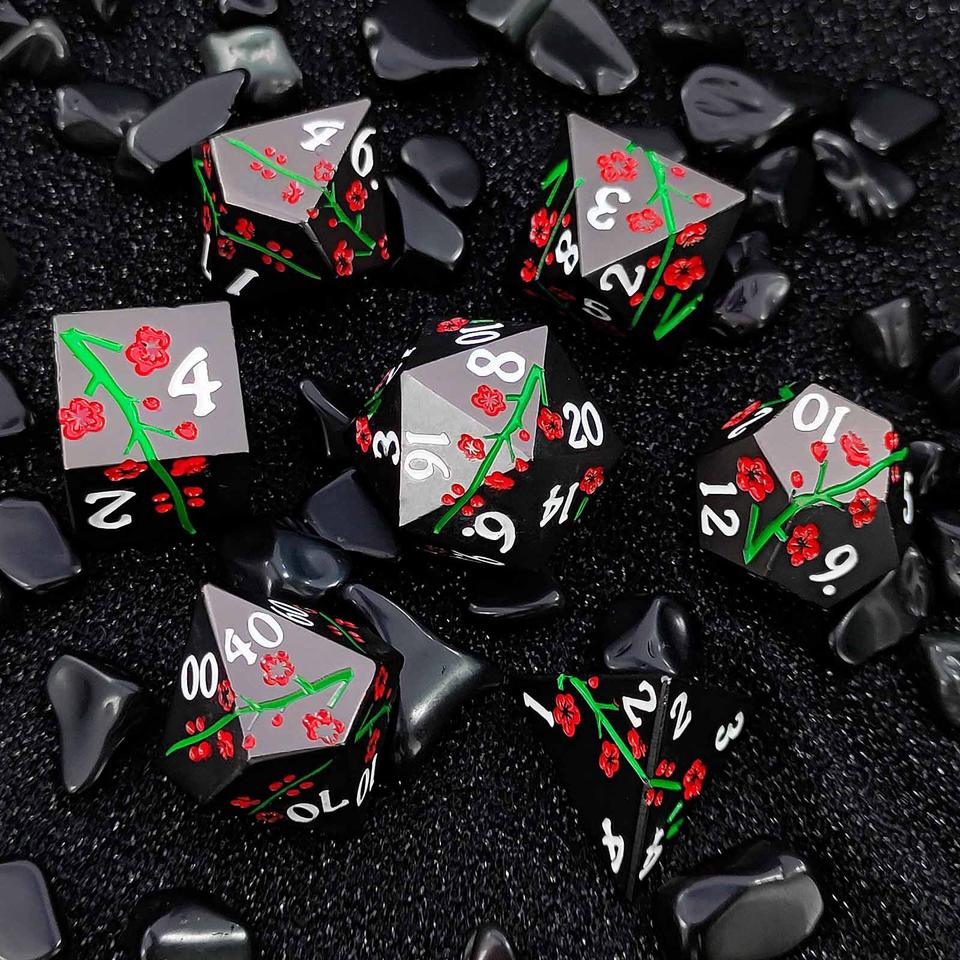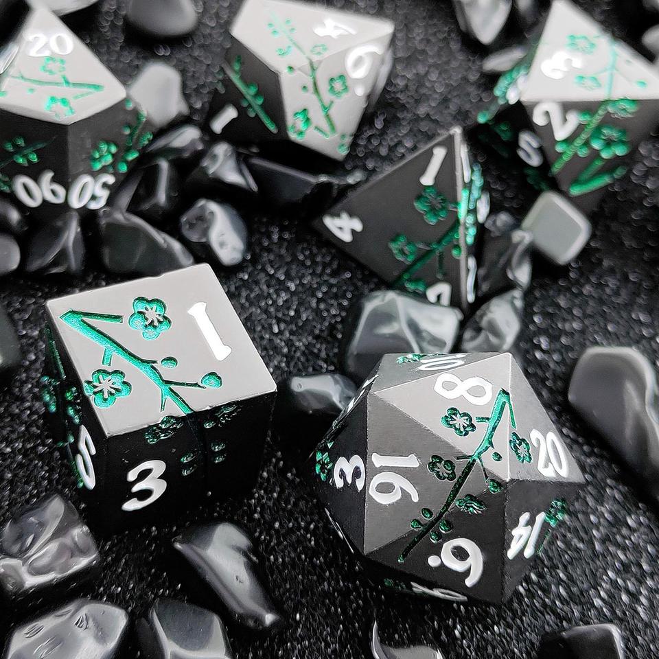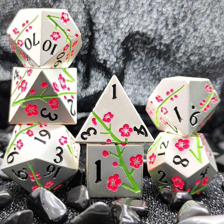 Vente en gros de dés métalliques Rpg mystère 7 pièces accessoires de jeu polyédriques mdn fleur de prunier ensemble de dés en métal avec emballage en boîte