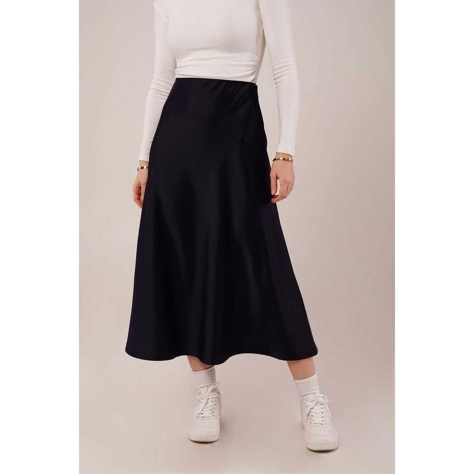 Jupe midi trapèze en satin bleu marine, style décontracté et sexy, coupe ajustée, avec boutons décoratifs en forme de cloche, idéale pour l'été, l'automne et le printemps.