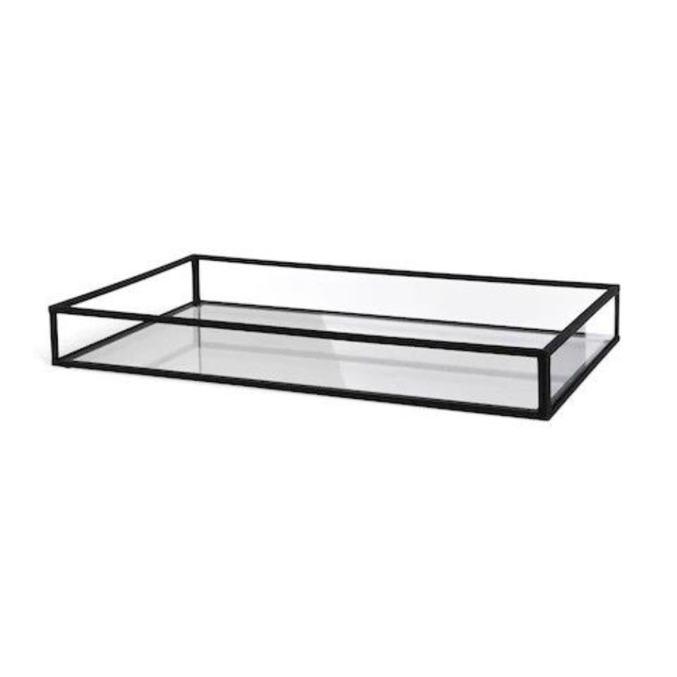 Plateau miroir rectangulaire moderne noir en métal et verre pour la décoration intérieure et l'exposition de vanité, pour le rangement de maquillage et de bijoux