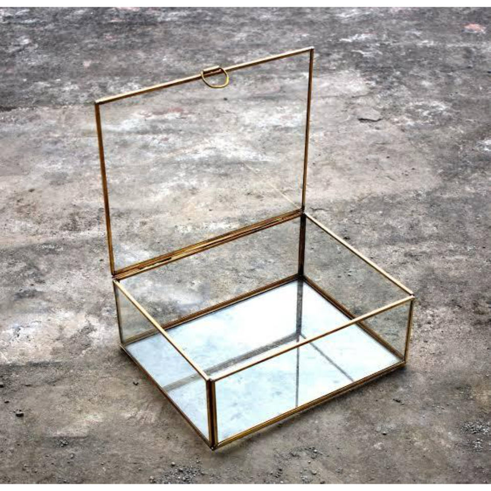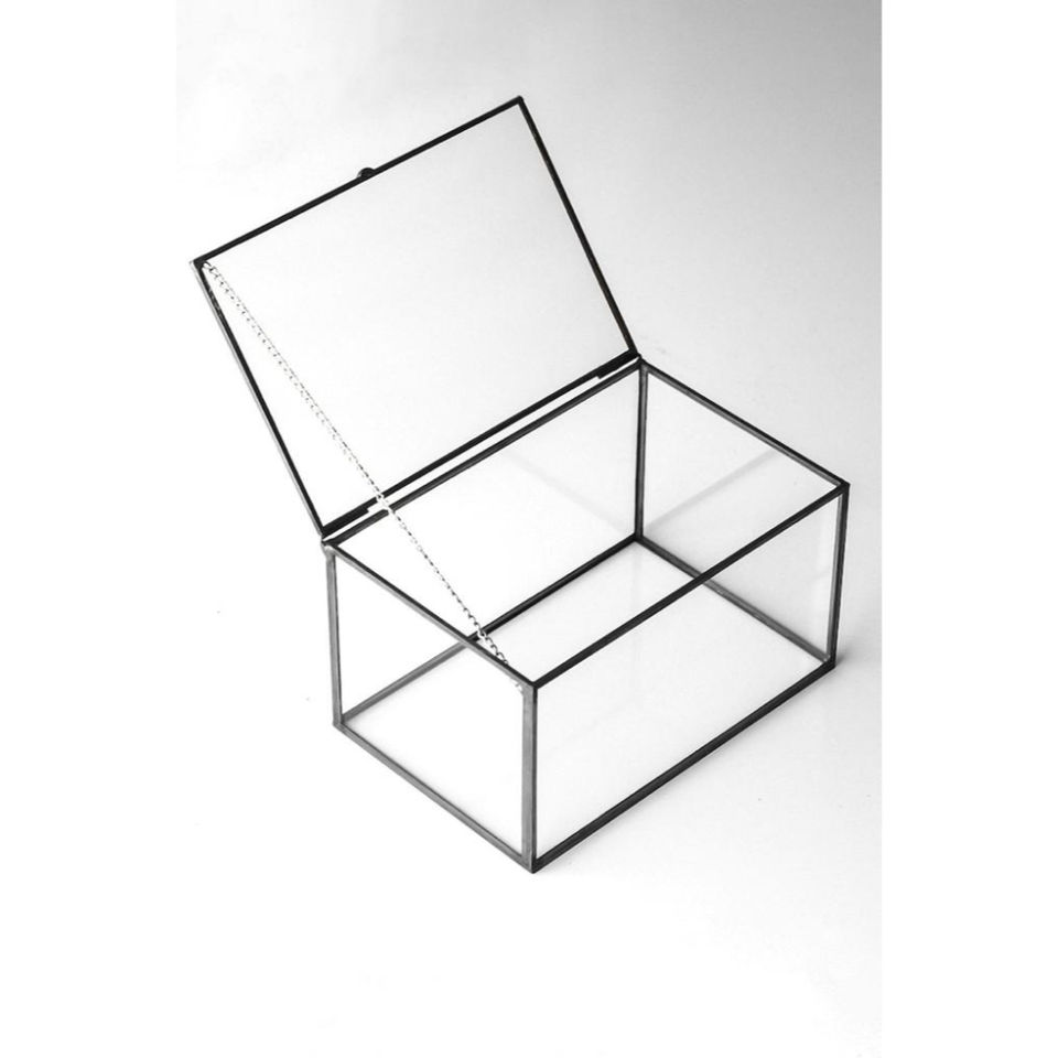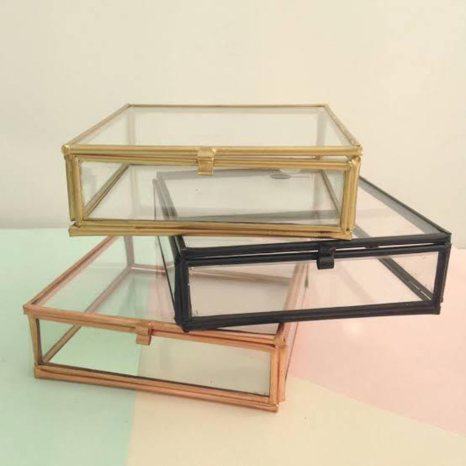 Boîte à bijoux rectangulaire moderne en verre avec cadre métallique, organisateur de présentation de bibelots et souvenirs en verre transparent de haute qualité, vente en gros