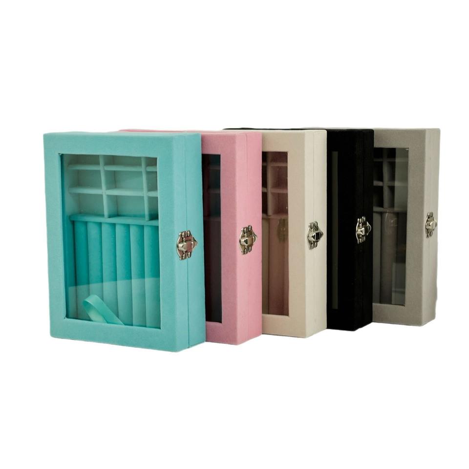 Wholesale Modern Single Layer Square Velvet Jewelry Gift Box Hook Loop Closure Glass Storage Case for Necklaces Rings Earrings
