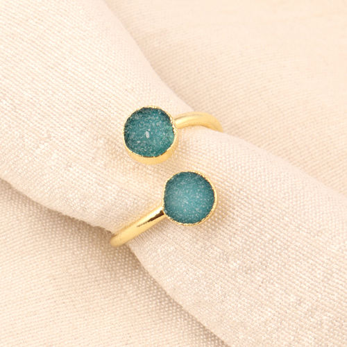 Wholesale Natural Round Blue Sugar Druzy Double Stone Ring Single Layer Adjustable Gold Brass Electroplating for Weddings