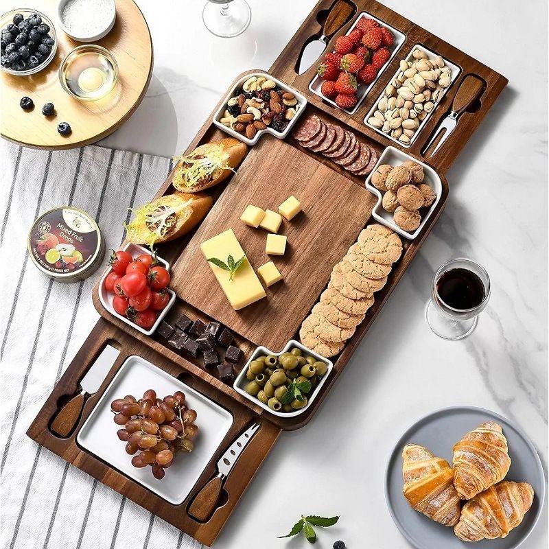 Vente en gros de nouveaux modèles de planches à fromage rectangulaires en bois d'acacia et de sets de couteaux pour les rassemblements entre amis