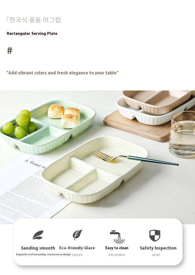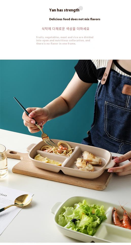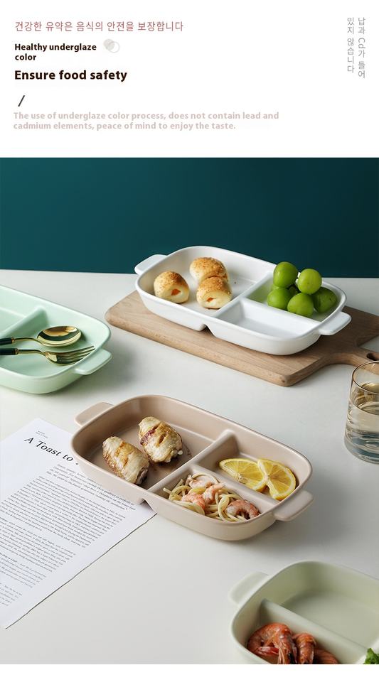 Assiette à compartiment rectangulaire à double poignée en céramique nordique, assiette à dîner à contrôle des portions, petit-déjeuner créatif, vente en gros