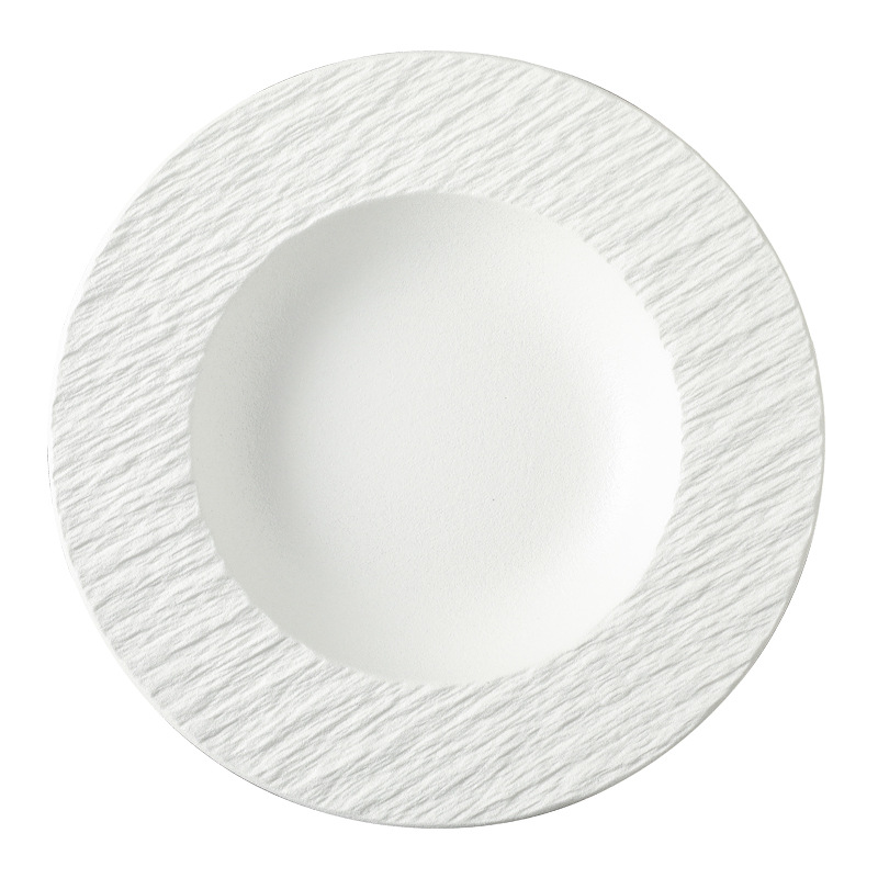 Vente en gros de vaisselle ronde profonde en céramique de style nordique Assiette à pâtes durable avec technique de gravure pour les mariages