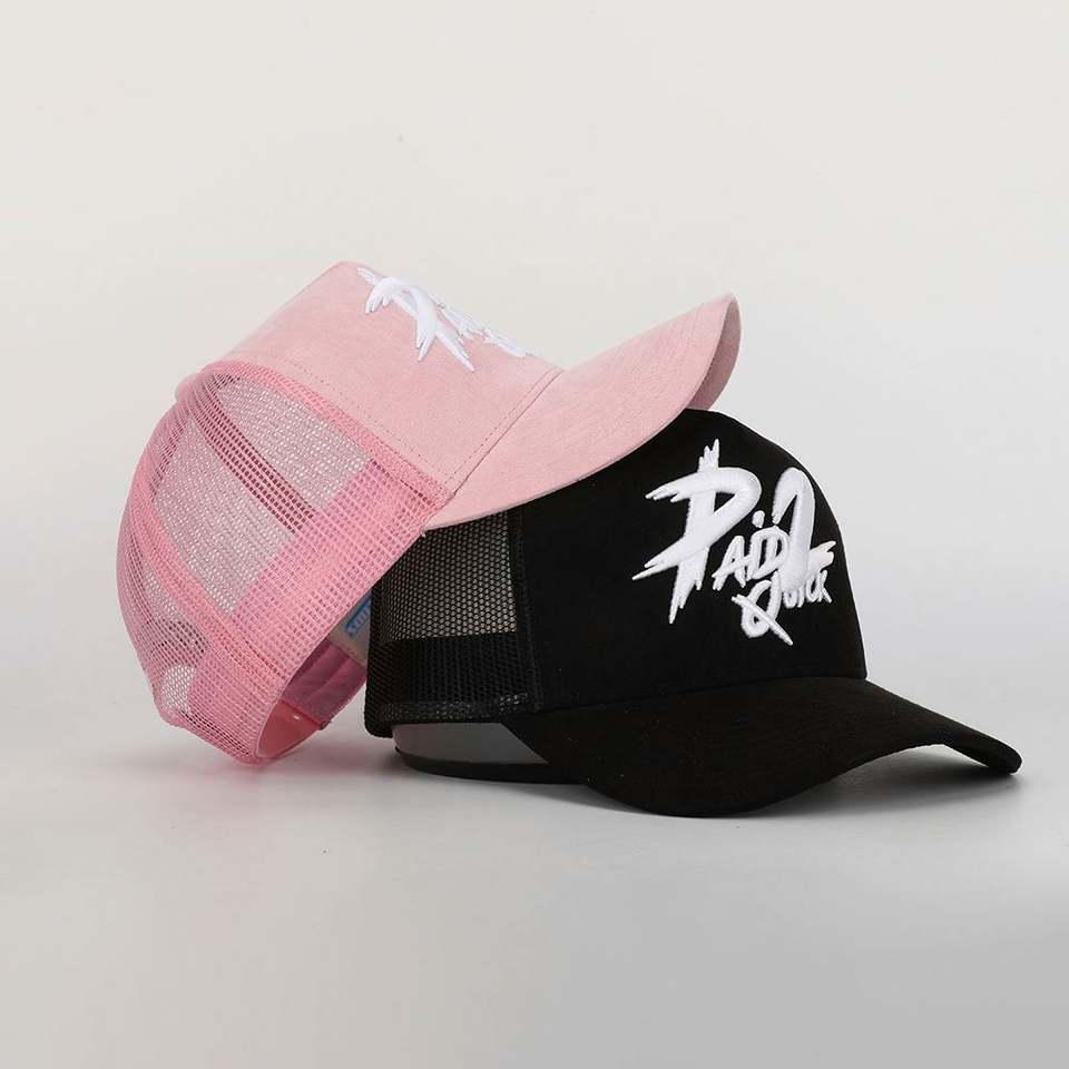 Vente en gros de casquette de camionneur OEM personnalisée 5 panneaux de haute qualité avec logo brodé en 3D, casquette de camionneur en daim avec dos en maille