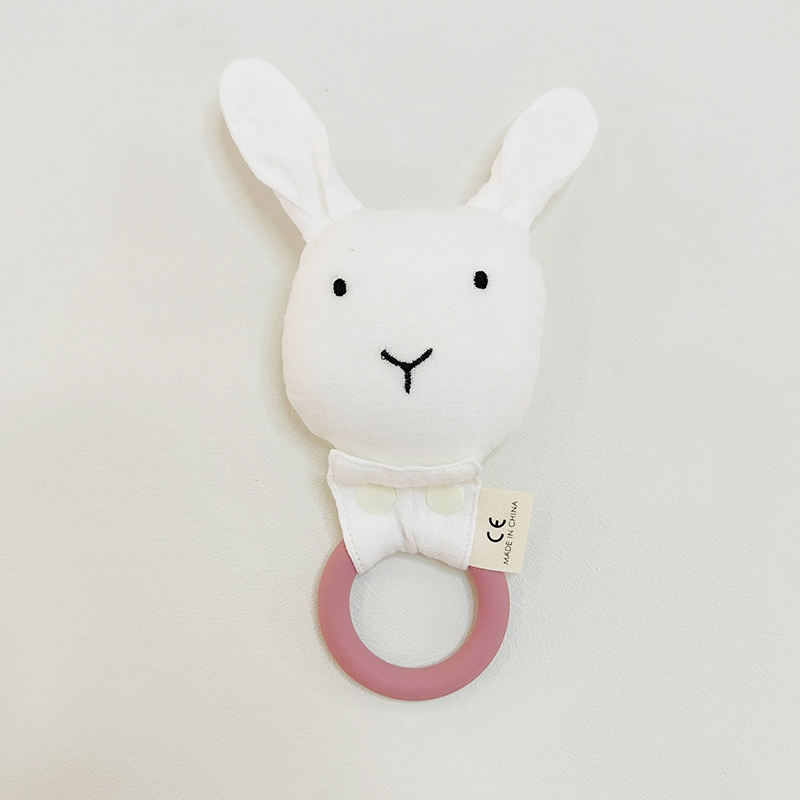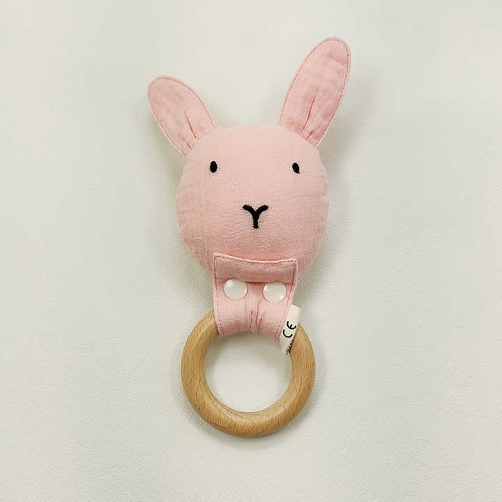 Hochet en tissu de lapin biologique Oem, jouet à tricoter, anneau de dentition en bois, jouet à mâcher pour bébé, hochet de dentition