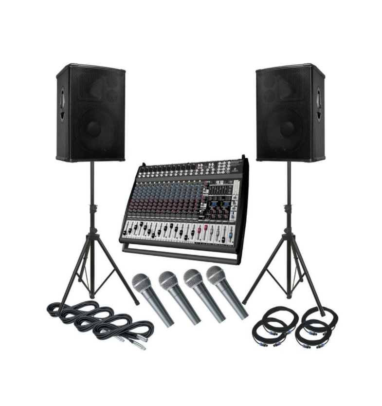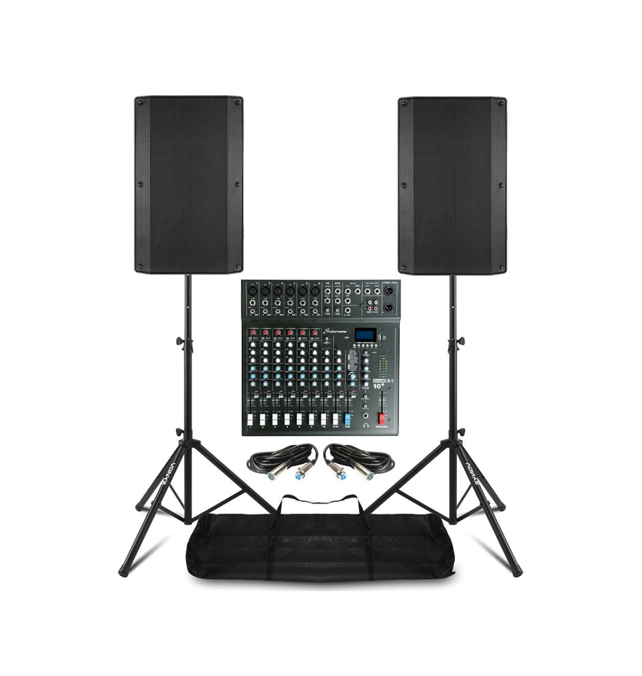 Système de sonorisation professionnel 8 canaux avec table de mixage amplifiée, deux enceintes passives de 10 pouces, pieds de haut-parleurs – Fournitures pour magasins de musique